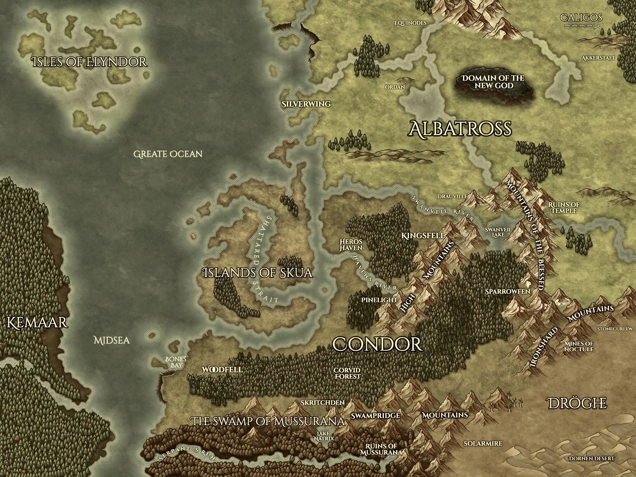 Condor ist ein kleines, aber widerstandsfähiges Königreich, eingebettet zwischen dem Swanveil-Fluss im Norden und den Swampridge-Bergen im Süden. Regiert von der königlichen Familie von ihrem Sitz in Kingsfell aus, bewahrt das Land durch eine enge Allianz mit der Extrajudicus-Kirche eine strenge und geordnete Gesellschaft. Gemeinsam arbeiten sie daran, Hexerei und Korruption fernzuhalten und sicherzustellen, dass das Reich rein bleibt.